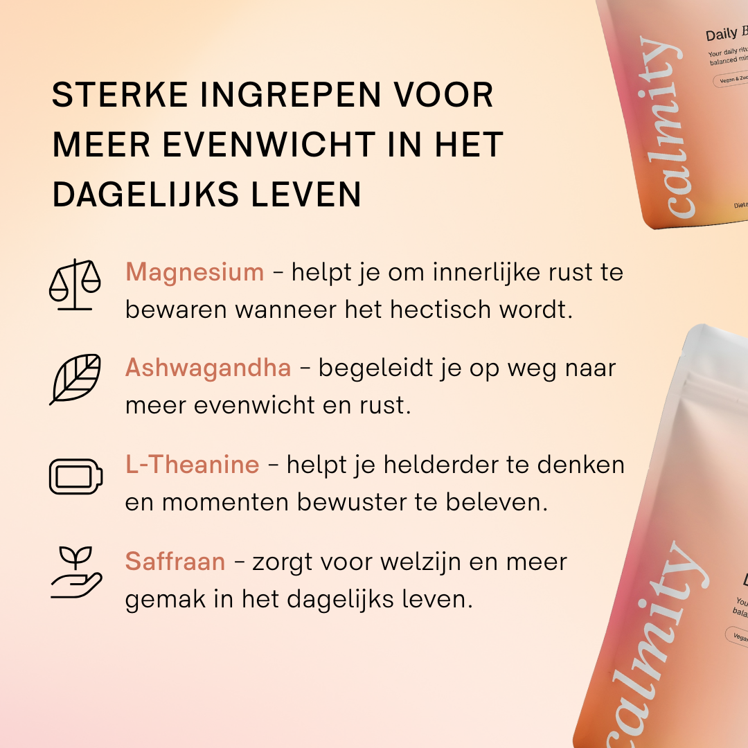 Zorgvuldig gecombineerde ingrediënten bevorderen helderheid van geest en helpen je om bewuste pauzes en rustmomenten in je dagelijkse routine in te bouwen, voor meer evenwicht en rust.